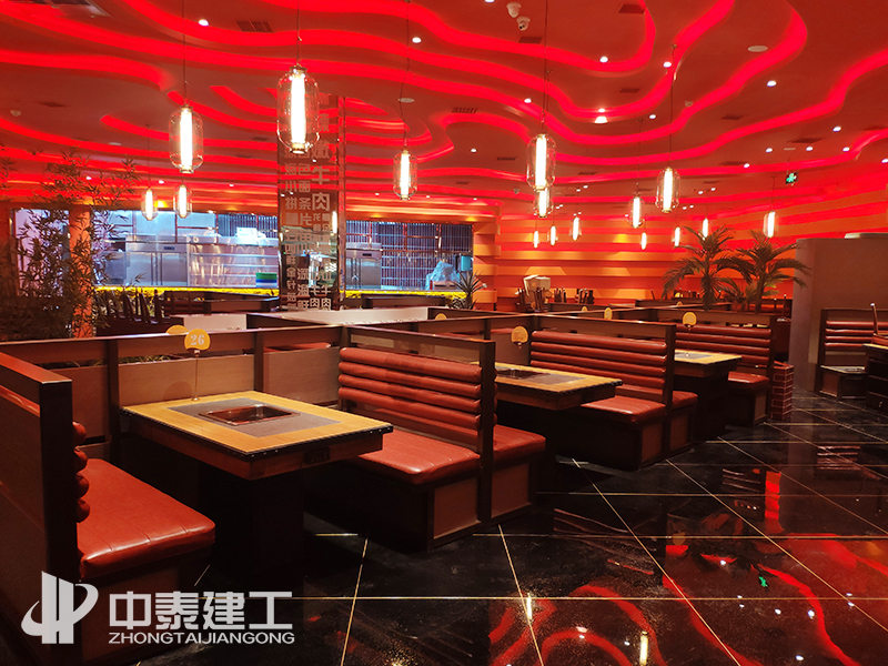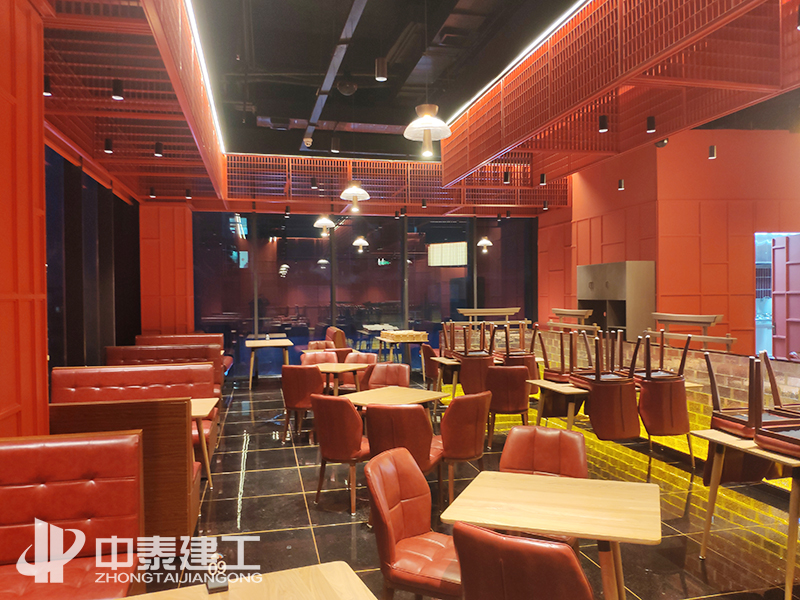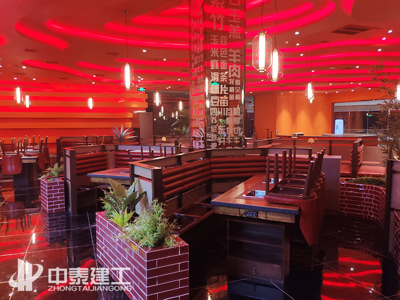工程概况:本工程包括给排水、电气、木门及玻璃门安装、玻璃砖隔断墙、石材干挂及墙地贴砖、吊顶、室内乳胶漆、不锈钢装饰、景观花艺等图纸范围内的内容。蒙度餐厅以红色系、金黄色系为主,顶部为多层云状吊顶,边缘做暗藏灯带槽;墙面以云状凸出造型为主,配以线性灯装饰;地面与餐位镶嵌摆放景观,使整体效果即红火又自然。湘菜馆主要以红色铁艺造型及金色不锈钢为主,配以景观花艺、玻璃砖隔断及灯光照明,使就餐环境优美自然。