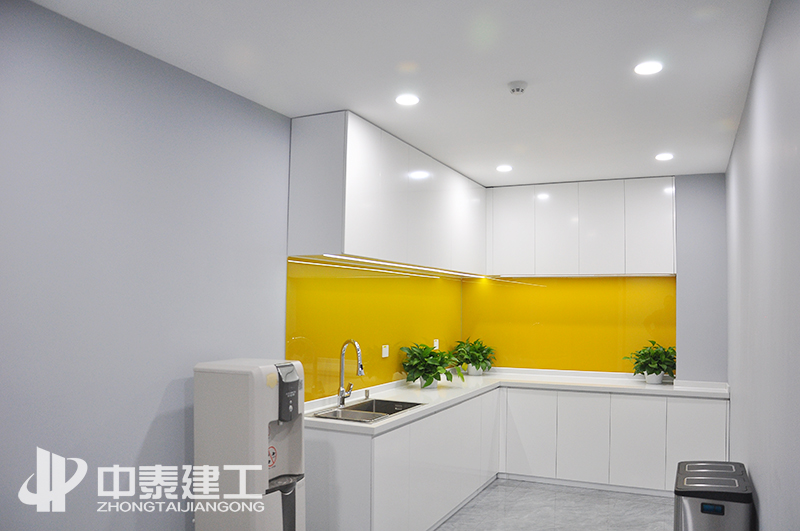 茶水间装修功能性要求比较高,收纳充足。明亮的黄色和淡雅的白色形成鲜明的对比,使得空间更加多彩、灵动。