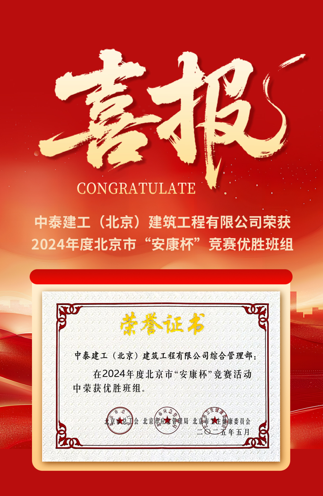 近日,北京市总工会、市应急管理局、市卫生健康委员会联合公布北京市“安康杯”竞赛活动结果的通报,韦德体育全新官网综合管理部荣获2024年度北京市“安康杯”竞赛优胜班组,这不仅是对公司安全生产工作的高度认可,更是对全体员工践行安全理念、共筑安全防线的生动诠释。