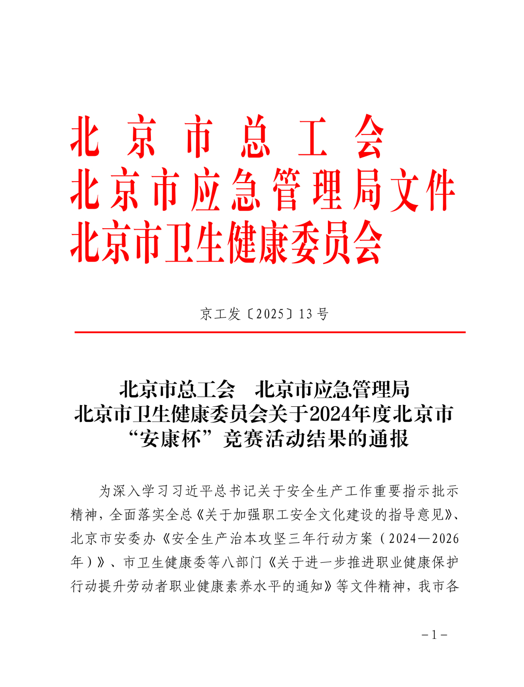 北京市“安康杯”竞赛活动由市总工会、市应急管理局、市卫生健康委员会等部门联合开展,为深入学习习近平总书记关于安全生产工作的重要指示批示精神,全面落实相关安全生产和职业健康等政策文件,通过竞赛形式推动企业安全生产和工会劳动保护工作创新发展,提升职工安全健康意识和自我保护能力,维护职工的安全健康权益,为安全生产形势贡献力量。
